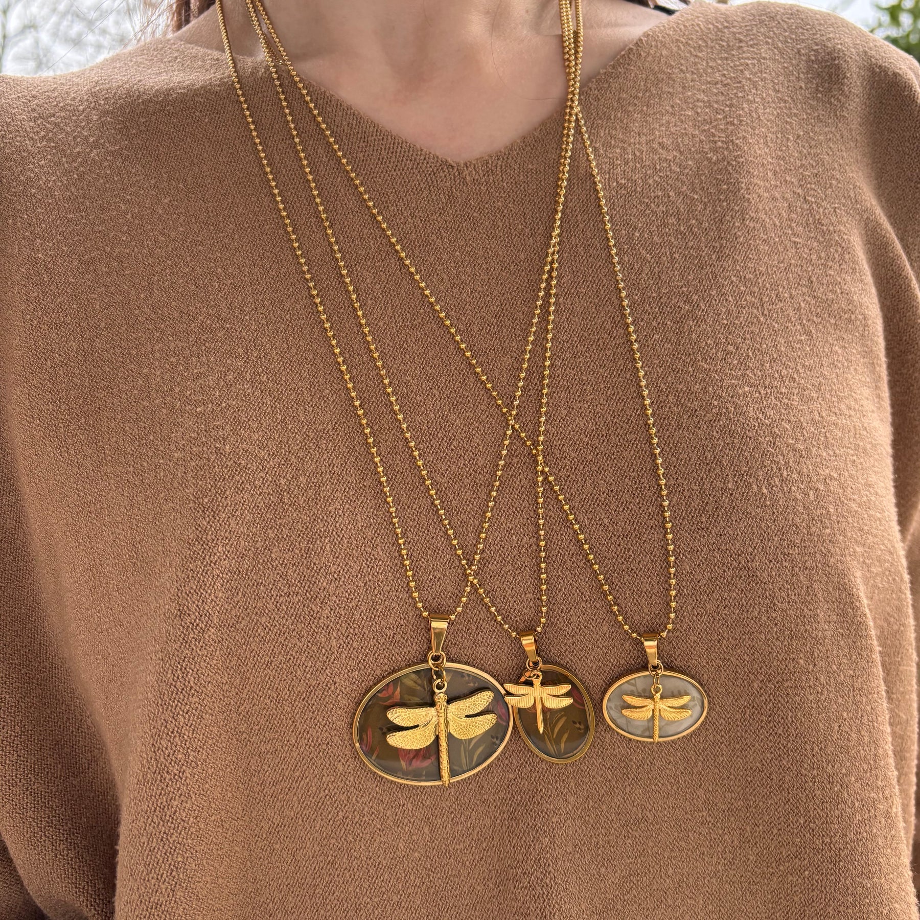 Le Collane Olivia sono realizzate in acciaio di alta qualità, dotate di un ciondolo romantico dal design vintage. Disponibili in due varianti, la libellula in ottone galvanizzato oro 18 kt nella versione piccola e in acciaio nella forma grande, queste collane offrono una combinazione di stile e durabilità, adatte per ogni occasione.