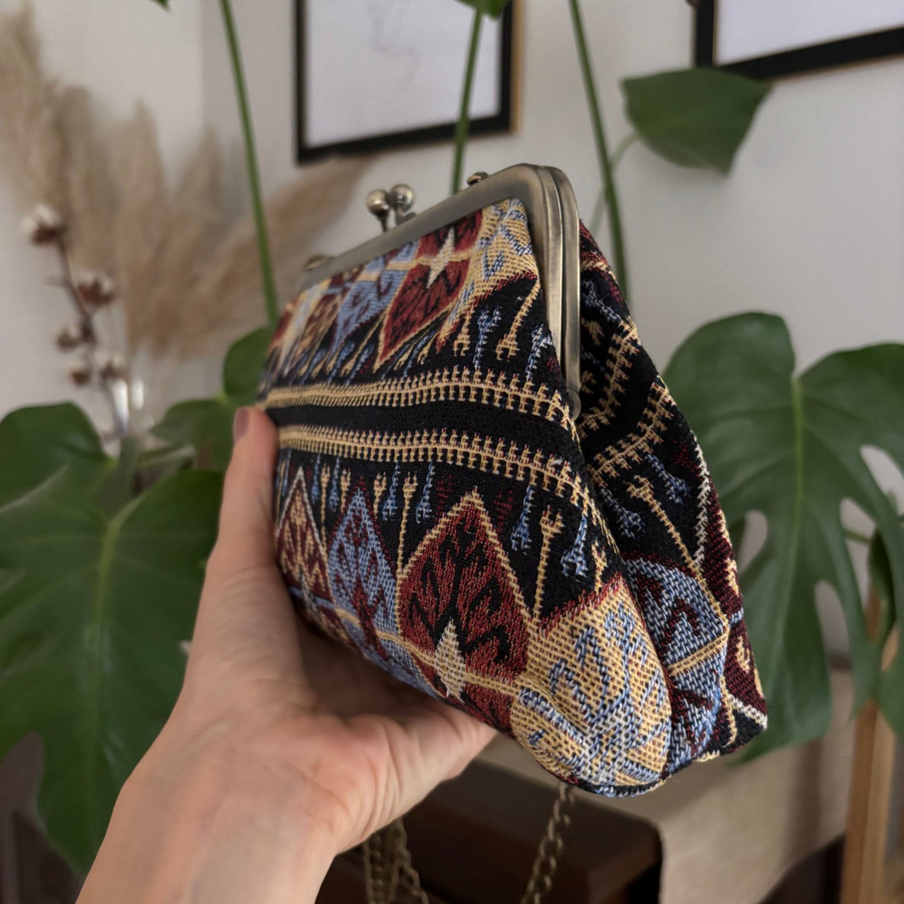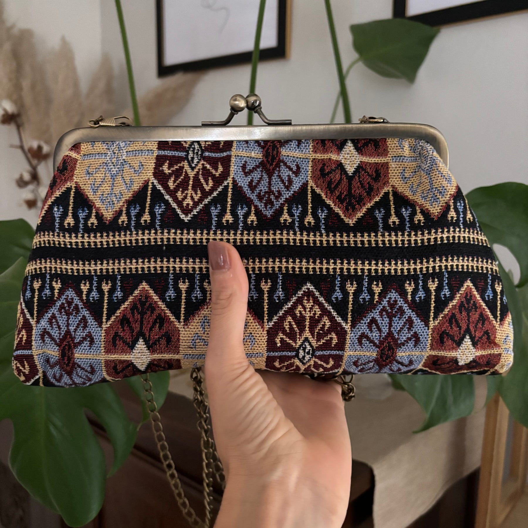 La Borsa Lolita è un elegante accessorio in tessuto d’ arredo di alta qualità che si distingue per la sua chiusura a clip clap in metallo e per la tracolla a catena removibile. Realizzata a mano, ha dimensioni di 17x29 cm ed è dotata di una tasca interna foderata per tenere al sicuro i tuoi oggetti. Aggiungi un tocco di stile e funzionalità al tuo look con la Borsa Lolita.