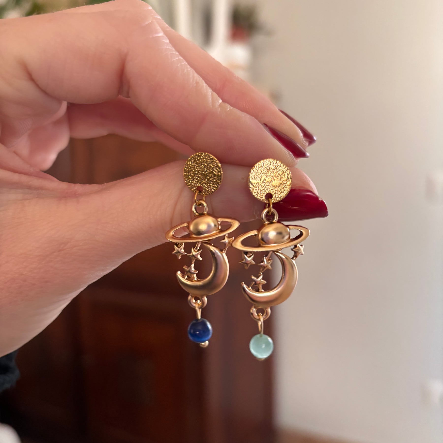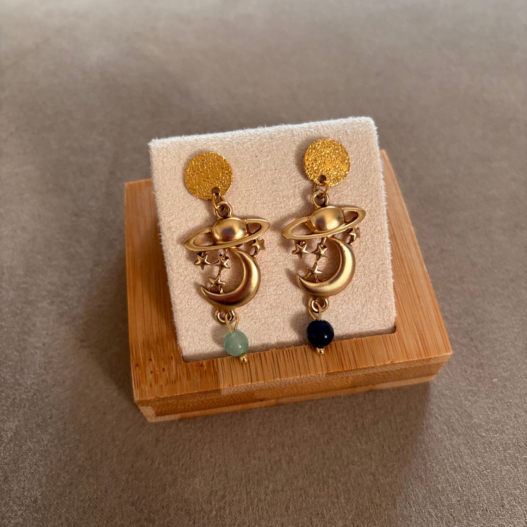 Gli Orecchini Pianeti presentano un perno in acciaio anallergico, garantendo comfort e sicurezza per chi ha pelli sensibili. Realizzati in zama oro mat, sono decorati con pietre finali che conferiscono un tocco elegante. Con una lunghezza di circa 4 cm, rappresentano un accessorio distintivo e raffinato.